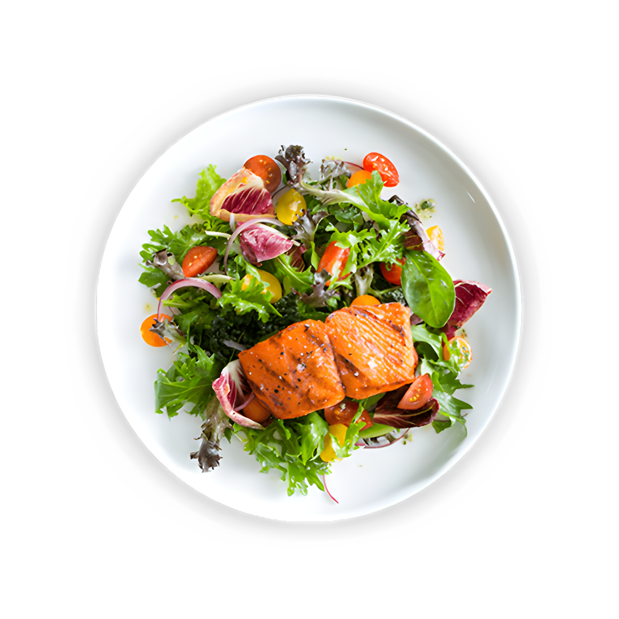 كباب مشويّ بالتوابل فوق خضروات مقرمشة، مع البصل المخلّل وصوص الزبادي.